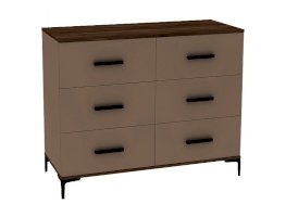 Широкий вместительный комод с шестью ящиками – функциональный модуль, который подходит не только для хранения вещей, но и для размещения телевизора. Столешница и основание комода подчеркнуты контрастным декором Дуб Табачный. Фигурные металлические опоры и ручки из массива органично дополняют модуль.