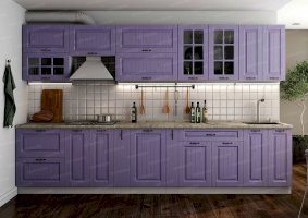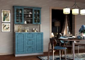 Ослепительная чистота и свежеть царят на кухне, обставленной мебелью из гарнитура «Кантри». Особую атмосферу создает отделка бирюзового, голубого, сиреневого цветов. Простой дизайн и хорошо различимая текстура натуральной древесины придает интерьеру деревенскую стилистку. Для изготовления комплекта использованы качественные и экологичные материалы.