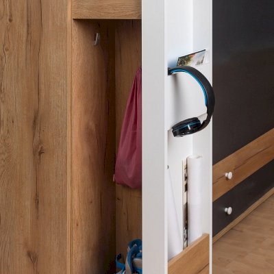 Нередко хобби ребенка перерастает в нечто большее и становится не только способом реализовать свои творческие способности, но и делом всей жизни. Уникальный выдвижной шкаф для хобби ЛОЙС 85 с двумя зонами хранения: внутренняя закрытая зона и фасадная часть с карманами. Внутри шкафа полки с ограничителями и ниша с крючками, где можно хранить форму для тренировок, мячи, ролики, наборы для творчества и другие аксессуары для хобби. Зона хранения на самом фасаде включает в себя: карман для высоких бумаг и ватманов, ручку, выполненную виде полочки, и два крючка, на которые удобно повесить заработанные медали, скакалки, элементы декора. Выдвижная система ЛОЙС 85 на роликах оснащена широкими шариковыми направляющими полного выдвижения. С ЛОЙС 85 в комнате появится место для хранения вещей тесно связанных с увлечениями детей. Модуль обязательно крепить к стене!
