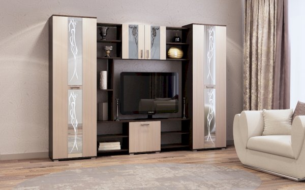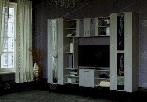 Гостиная "Прага" - это классическая среднегабаритная зальная стенка. В гостиной «Прага» применяются современные декоры, а фасадная часть украшена зеркалами и стеклами с пескоструйным рисунком. Все элементы гостиной устанавливаются на регулируемые ножки-опоры.