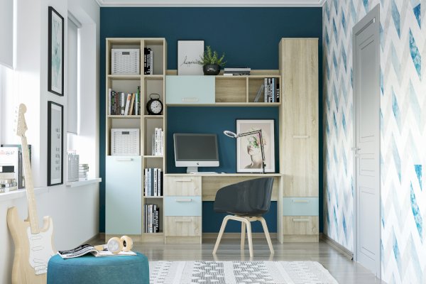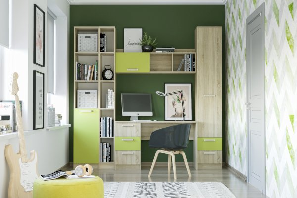 Полка органично дополнит рабочее место в детской. Закрытая секция модуля подойдет для хранения книг. Газлифты максимально высоко поднимают фасад вверх, обеспечивая большую площадь обзора содержимого. Предметы декора будут хорошо смотреться в открытых секциях полки.