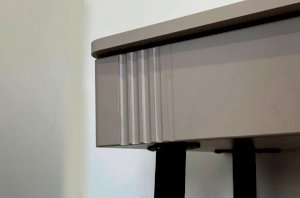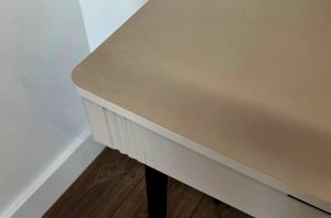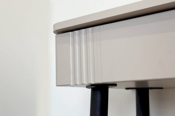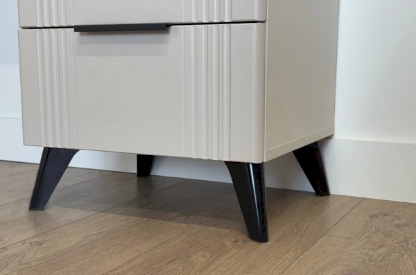 Трюмо изготовлено из качественных материалов: корпус выполнен из ЛДСП, что гарантирует прочность и долговечность, а фасад из МДФ в плёнке ПВХ не только выглядит эстетично, но и защищает трюмо от повреждений. Особое внимание заслуживает фрезеровка фасадов, которая придаёт изделию изысканный вид.