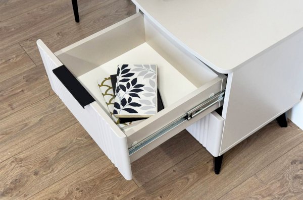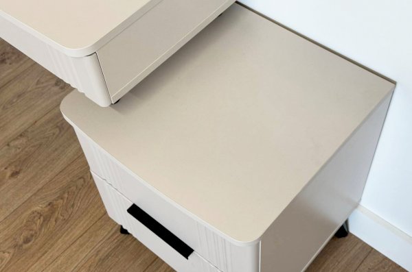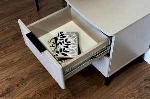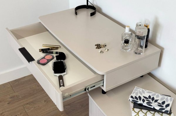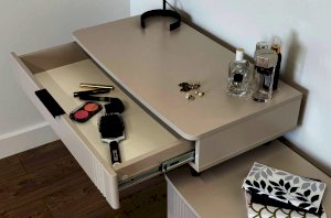 Благодаря своему дизайну трюмо «Катрин» легко впишется в любой интерьер и гармонично сочетается с другими модулями спальни «Катрин». Выкатные ящики предоставляют достаточно места для хранения различных предметов, а возможность использования трюмо в качестве письменного стола делает его универсальным элементом мебели.