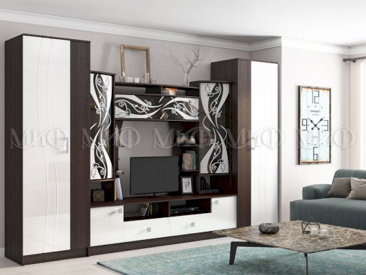 Белая гостиная из МДФ. Яркое решение для гостиной комнаты. Стеклянные дверцы верхних фасадов за счет их декорирования матовым рисунком, выглядят стильно и практично. Гостиные со стеклом - хорошая возможность создать уникальный интерьер.
